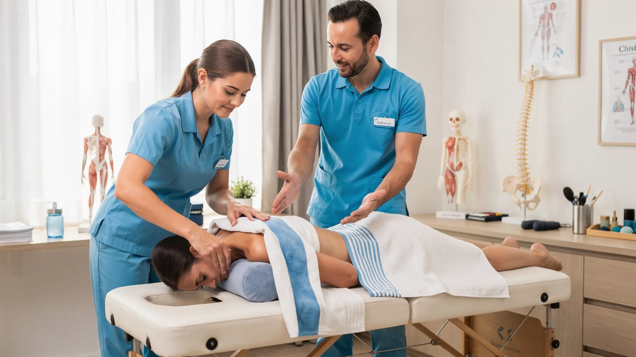 A clinician palpates a patient’s upper back and shoulder area on a treatment table while another provider demonstrates gentle soft tissue work on the neck and trapezius, illustrating coordinated chiropractic and massage-style care in a calm clinic room.