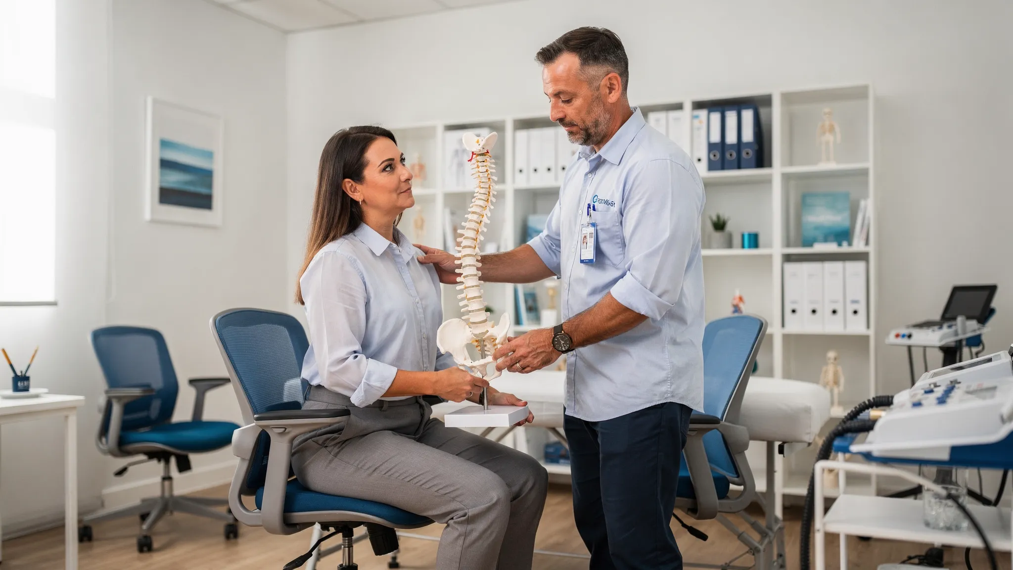 A chiropractor performing a musculoskeletal assessment with a patient in a modern clinic room, checking posture and spinal movement while explaining findings.